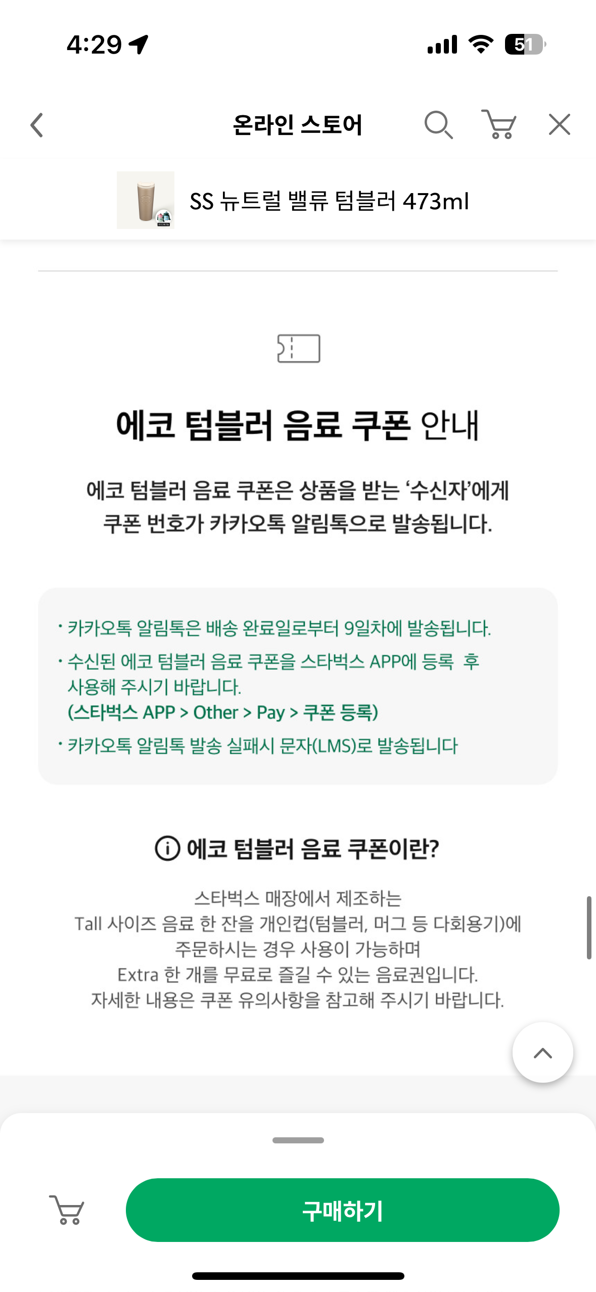 에코 텀블러 쿠폰은 텀블러 내에 들어있지 않아요..